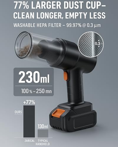 - 230ml dust cup is 77% larger than standard models, reducing the need for frequent emptying.
