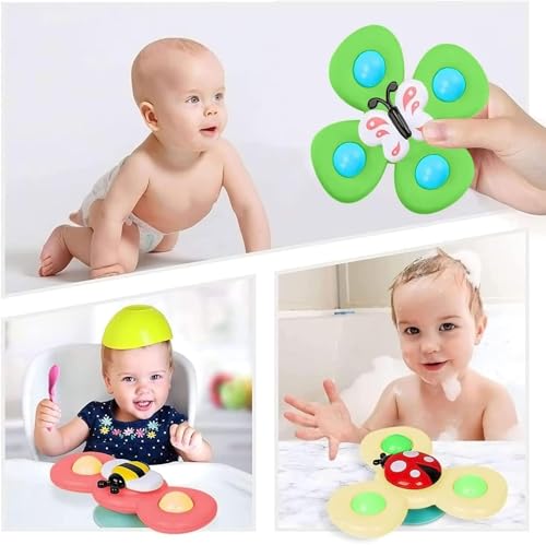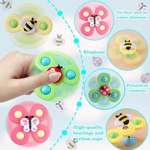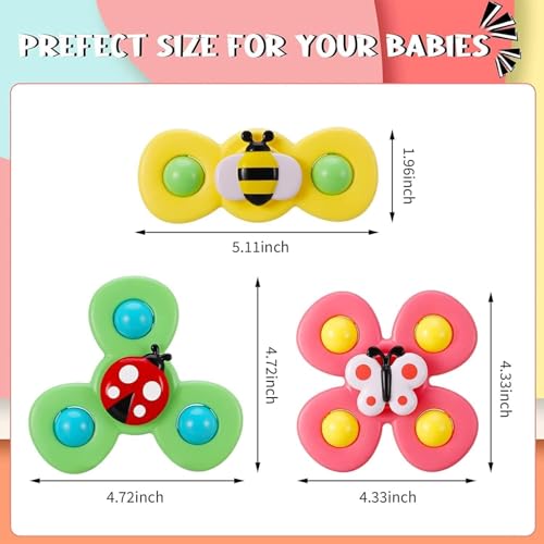 - Three cute cartoon-shaped suction cup spinner toys with baby rattle designed for toddlers aged 1-3.